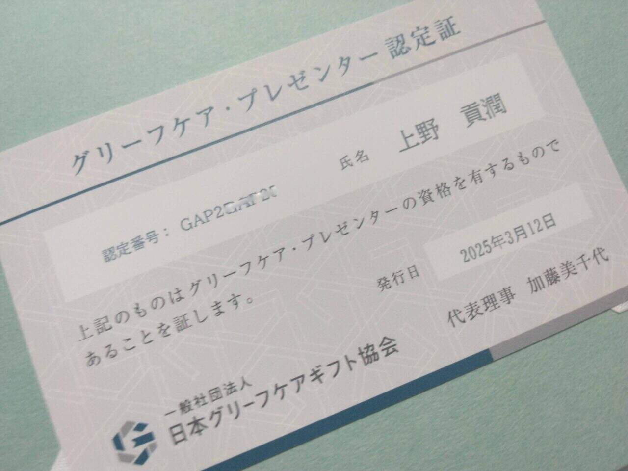 - 一般社団法人 日本グリーフケアギフト協会(遺族が安心して悲しみに浸れる社会を実現)認定グリーフケア・プレゼンター